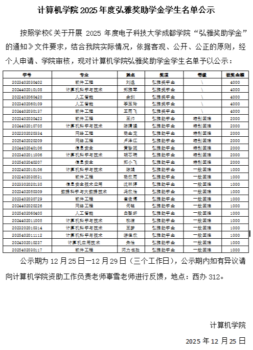 计算机学院2025年度弘雅奖助学金学生名单公示